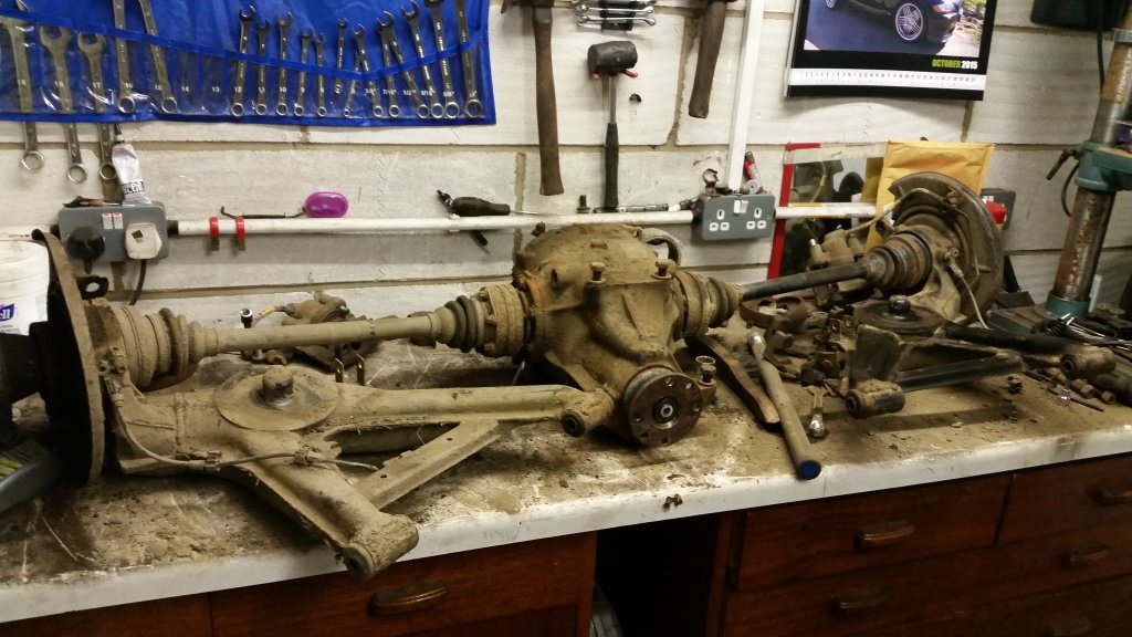 Resting on the bench, torn down ready for reassembly. Lee is going to spend some time tomorrow cleaning up some of the parts like the calipers and caliper carriers.
